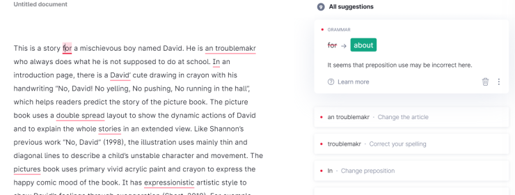 DONE 완료 버튼을 누르면 다음과 같이 Grammarly 가 내문장의 오류를 찾아주거나 적당한 말을 추천해줍니다~