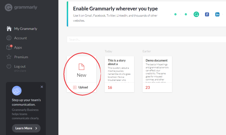 3. 웹사이트에서 하실경우 My Grammarly 로 가셔서 New 화일을 클릭하거나 문서 (*.doc) 를 업로딩합니다 ~