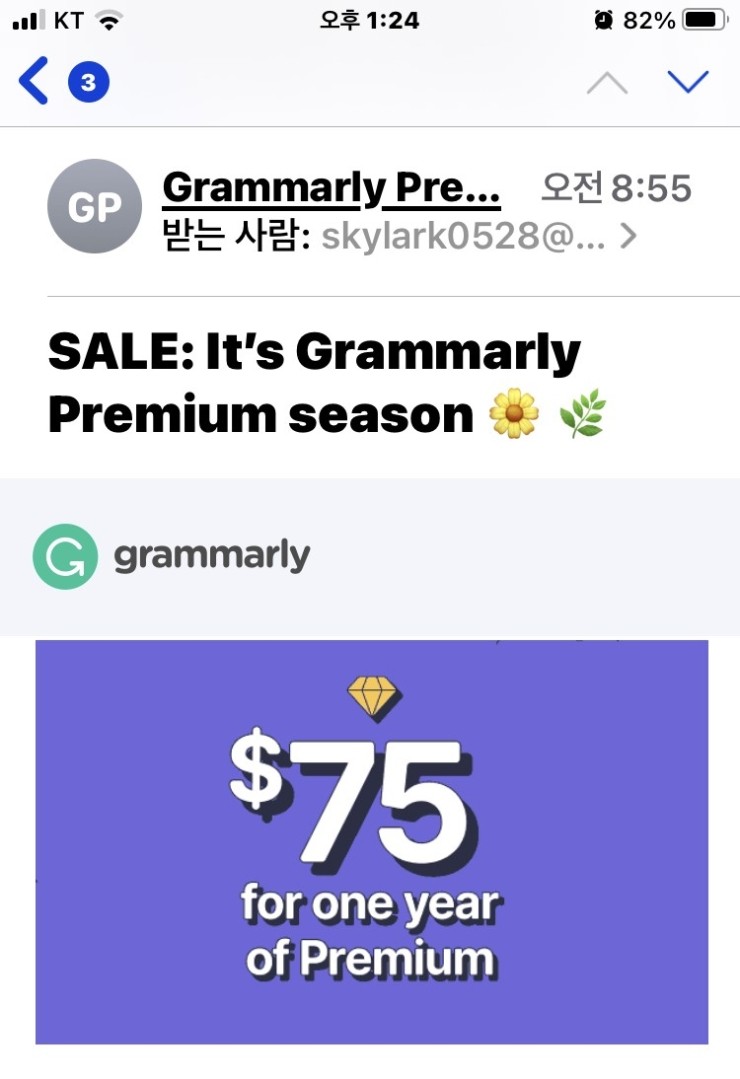 즉 $75/12개월, 월 $ 6.25 로 Grammarly 를 사용할수 있습니다.
